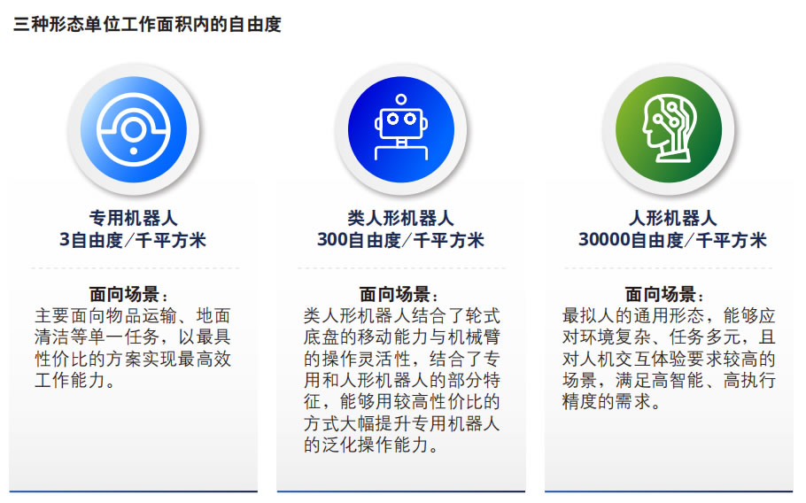 基于 “單位工作面積自由度”這一指標(biāo),可以更好地理解專用、類人形、人形三種形態(tài)機器人各自 的優(yōu)勢和適用場景,以及如何根據(jù)特定的應(yīng)用需求選擇合適的機器人形態(tài),從而進一步推動生態(tài)的 構(gòu)建: