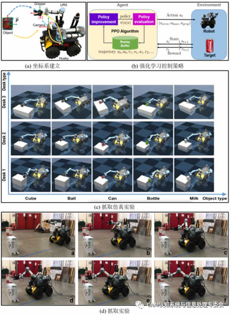 中科院沈陽自動化所的Wang利用深度強化學習算法和視覺感知相結合的方法來完成移動機器人(如圖3(a))在非結構環境下的移動操作[7]。作者將移動操作過程看做一個標準的強化學習問題,首先通過雙目相機通過DOPE獲取目標物體的6D姿態p以及機器人本體的當前狀態st,接著通過基于PPO的強化學習算法預測機器人的本體,機械臂以及機械手的運動并控制機器人本體運動,后機器人的運動狀態st+1和響應rt,其中響應主要包含了整個系統的控制響應rctrl、機械手末端的位置響應rdist以及抓取狀態rgrasp(如圖3(b))。后作者在仿真環境和真實環境下測試了不同G度下的抓取成功率,在仿真中,立方體的抓取效果好達到了90%的成功率,而球類物體較差僅有60%左右,而在實際測試過程中,在姿態估計正確的前提下可實現目標物體的成功抓取(如圖3(c)(d))。