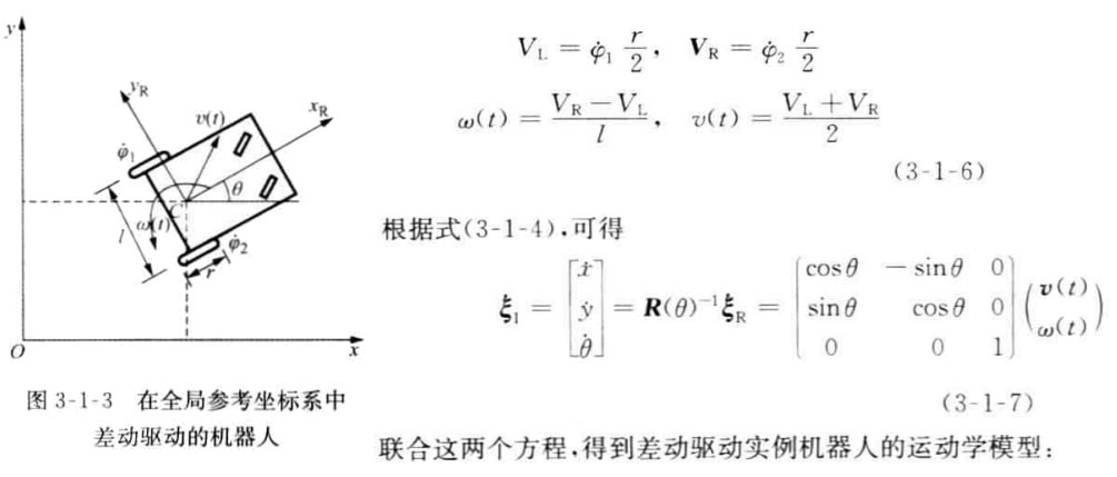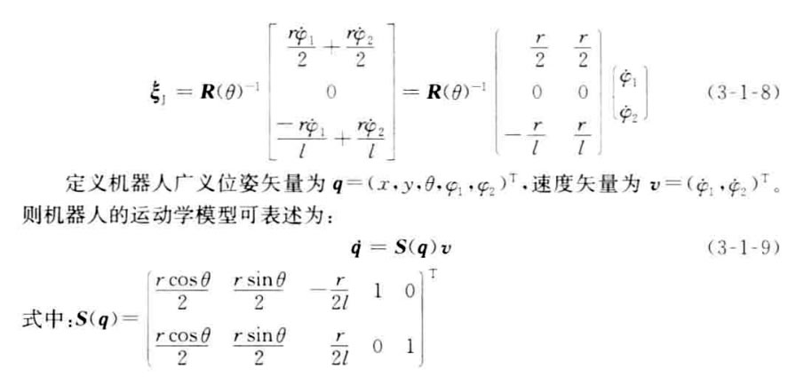 假定機器人在運動中質心的線速度為v(t),    角速度為w(t),   左右兩輪的轉速分別為ψ和 中₂,機器人左右兩輪的運動速度分別為 VI,    VR。給定r,1,θ,   以及根據圖3-1-3所示的幾 何關系,考慮到移動機器人滿足剛體運動規 律,下面的運動學方程(3-1-6)成立。