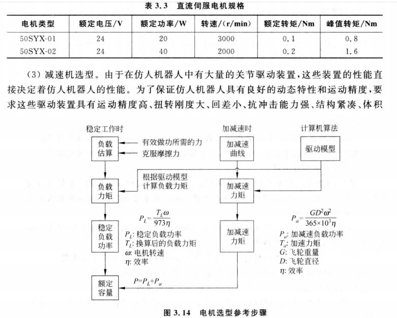 電機(jī)是將電能轉(zhuǎn)化為機(jī)械能的部件,由此發(fā)生的力經(jīng)過以減速器為核心的動(dòng)力傳遞 系統(tǒng)到達(dá)負(fù)載端。在此過程中, 一部分力克服摩擦,以熱能的形式耗散出去,因此傳動(dòng)效 率無法達(dá)到100%。在實(shí)際設(shè)計(jì)中,應(yīng)該將上述路線的順序倒過來,即以負(fù)載的大小和摩 擦系數(shù)及運(yùn)動(dòng)效率去推算電機(jī)的容量。施加于電機(jī)的負(fù)載大致可以劃分成三種基本類 型:有效力、無效力、慣性力。智能交互機(jī)器人的驅(qū)動(dòng)器大致有直流電機(jī)、步進(jìn)電機(jī)、舵機(jī)。如 圖3.14所示為電機(jī)選擇的方法和步驟。從圖中可知,決定電機(jī)容量時(shí),涉及負(fù)載估算、 驅(qū)動(dòng)對象運(yùn)動(dòng)規(guī)律確定、傳動(dòng)系統(tǒng)轉(zhuǎn)動(dòng)慣量折算等內(nèi)容[96]。