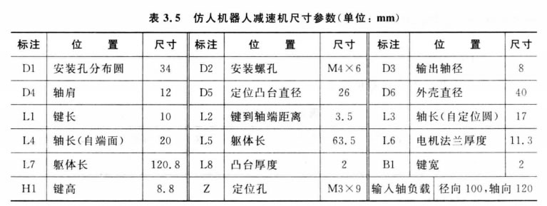 (2)直流伺服電機(jī)選型。根據(jù)上面的分析,為本節(jié)設(shè)計(jì)的智能交互機(jī)器人選用了兩種 類型的直流伺服電機(jī),分別是上海瑞克科技發(fā)展有限公司的50SYXB-01 和 5 0SYXB- 02,質(zhì)量大約為0.5~1.0kg, 規(guī)格如表3.3所示。從表中不難看出這種直流伺服電機(jī) 轉(zhuǎn)速非常高,Z高可達(dá)到3000r/min(轉(zhuǎn)/分鐘);而其轉(zhuǎn)矩又很小,不能直接用于關(guān)節(jié)驅(qū) 動(dòng)裝置。