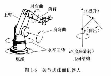 這種機器人主要由底座(或軀干)、上臂和前臂構成。上臂和前臂可在通過底座的垂直平面上運動,如圖1-6所示。在前臂和上臂間,機械手有個肘關節;而在上臂和底座間, 有個肩關節。在水平平面上的旋轉運動,既可 由肩關節進行,也可以繞底座旋轉來實現。這 種機器人的工作包跡形成球面的大部分,稱為 關節式球面機器人。