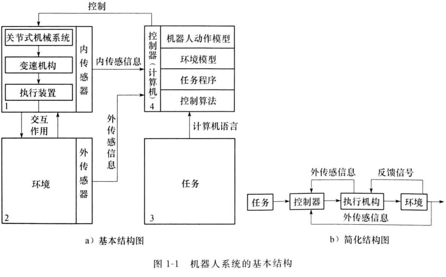 一 般情況下, 一 個機器人系統由下列四個互相作用的部分組成:機械手、環境、任務 和控制器,如圖1 - 1a 所示,圖1 - 16為其簡化形式。