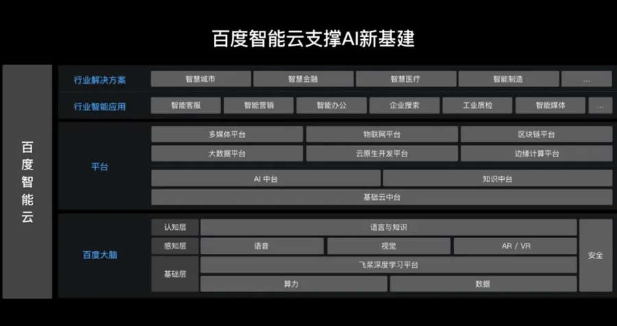 6月11日,百度發布AI新基建版圖,目標成為中國新基建AI服務大提供商。依托百度大腦、飛槳深度學習平臺、百度智能云、芯片、量脈、超級鏈等在內的新型AI基礎設施,百度在智慧城市、智能交通、智慧金融、智能客服與營銷、智慧能源、智慧醫療、智能汽車、工業互聯網和智能制造等八大L域推動產業智能化升級。