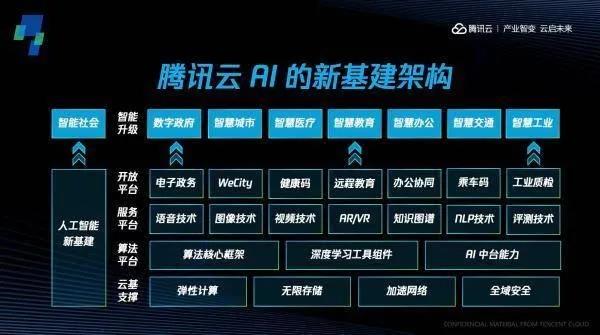 騰訊云提供底層算力資源,算法平臺將AI能力應用到實際的業務場景中,AI服務平臺將AI技術以云服務形式提供給行業用戶,降低AI應用門檻;騰訊AI開放平臺將連接騰訊AI能力與產業,推動AI技術和應用不斷進步。