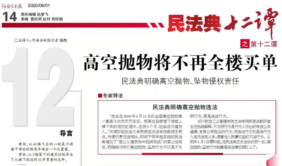 鄭州航空工業(yè)管理學院文法學院民商法教研室主任張峣解釋,不文明行為是行為人作出的有違公共道德、有背公序良俗的行為,而違法行為則是指行為人違反法定義務,侵害他人民事權益的不法行為。從明年1月1日零時起,在民法典正式生效的那一刻,G空拋物、墜物行為就算是被法律徹底盯上了。