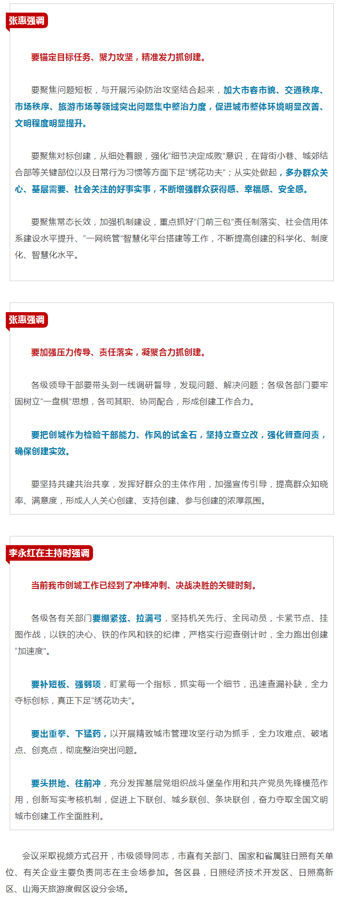 市委書記張惠講話,市委副書記、市長李永紅主持,市政協(xié)主席王斌,市人大常委會主任G杰,市委副書記李在武出席,市委常委、統(tǒng)戰(zhàn)部長楊留星通報創(chuàng)城模擬測評情況。東港區(qū)、嵐山區(qū)、日照經(jīng)濟技術(shù)開發(fā)區(qū)、日照G新區(qū)、山海天旅游度假區(qū)、市城市管理局、市市場監(jiān)管局、市公安局交警支隊負責(zé)同志作表態(tài)發(fā)言。