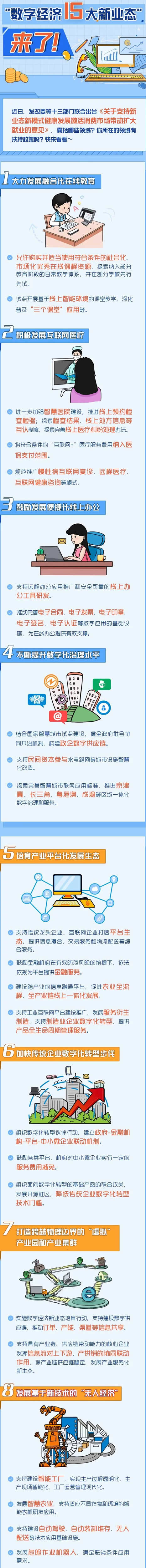 新出臺(tái)的舉措重點(diǎn)支持15種新業(yè)態(tài)新模式——在線教育、互聯(lián)網(wǎng)醫(yī)療、線上辦公、數(shù)字化治理、產(chǎn)業(yè)平臺(tái)化發(fā)展、傳統(tǒng)企業(yè)數(shù)字化轉(zhuǎn)型、“虛擬”產(chǎn)業(yè)園和產(chǎn)業(yè)集群、“無(wú)人經(jīng)濟(jì)”、培育新個(gè)體經(jīng)濟(jì)支持自主就業(yè)、發(fā)展微經(jīng)濟(jì)鼓勵(lì)“副業(yè)創(chuàng)新”、探索多點(diǎn)執(zhí)業(yè)、共享生活、共享生產(chǎn)、生產(chǎn)資料共享及數(shù)據(jù)要素流通。