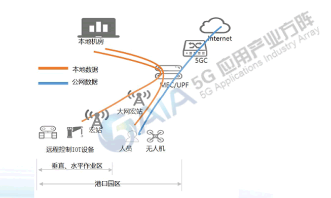 案例整體采用SA組網,在港口區域部署大網宏站和專用宏站,提供港口生產業務的頻率專用服務,通過接入控制方案保障其它用戶無法接入專網小區,大大增強其業務性能(如時延、可靠性、速率)保障效果;目前已完成多個堆場連續覆蓋,滿足港口對速率、時延、可靠性、安全隔離等方面需求。核心網部署專用5GC核心網切片,將UPF下沉至港口區,保障港口敏感 業務的數據安全隔離性,其余核心網設備位于運營商機房,物理設備與其他項目共享,通過切片進行虛 擬隔離。港機PLC等港口設備通過CPE接入5G網絡,港區內的人員和無人機等則通過5G基站直接接入。