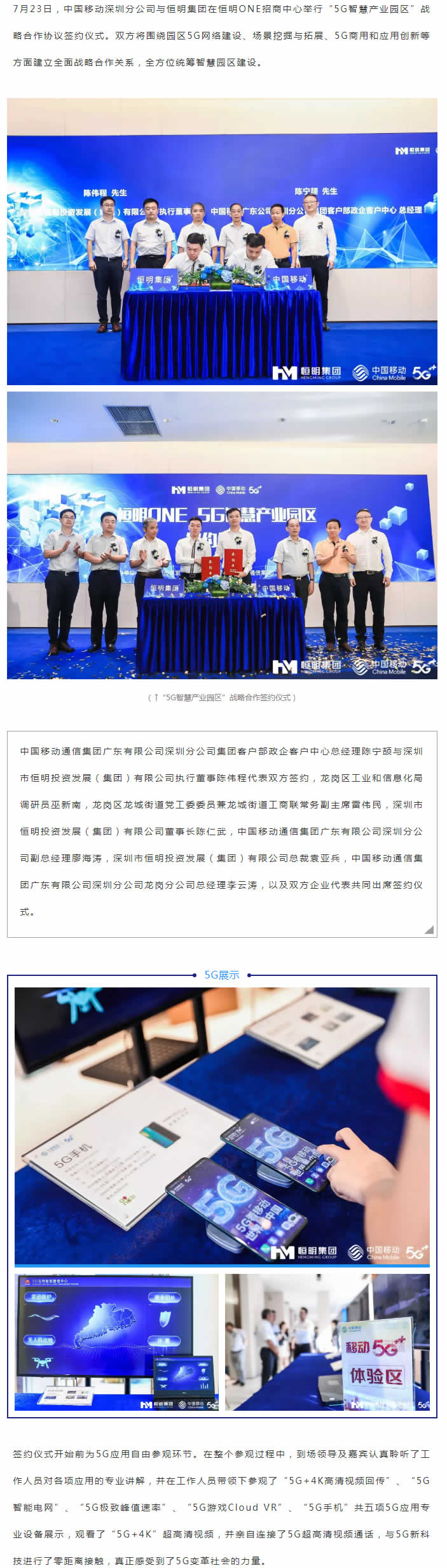 深圳移動與恒明集團簽署5G+智慧產業園區戰略合作框架協議,雙方攜手推動深圳市重大項目恒明ONE產業園的5G智慧建設與創新生態升級,在園區的5G專網建設、智慧樓宇、無線視頻監控、AI人臉識別、智能機器人、4K及8K超G清視頻直播等方面深入合作。