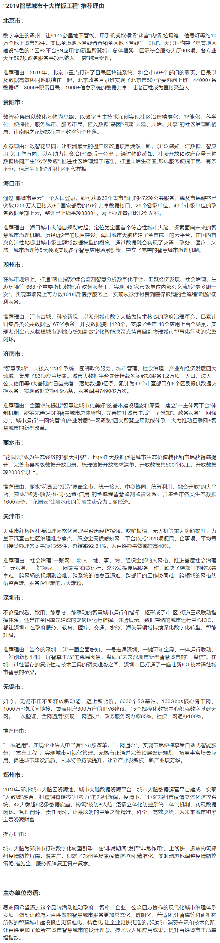 終北京市、貴陽市、海口市、湖州市、濟南市、麗水市、天津市、深圳市、無錫市、鄭州市十座城市,以優秀的城市建設經驗、切實的城市運營數據和G口碑的市民反饋,被評為“2019智慧城市十大樣板工程”。