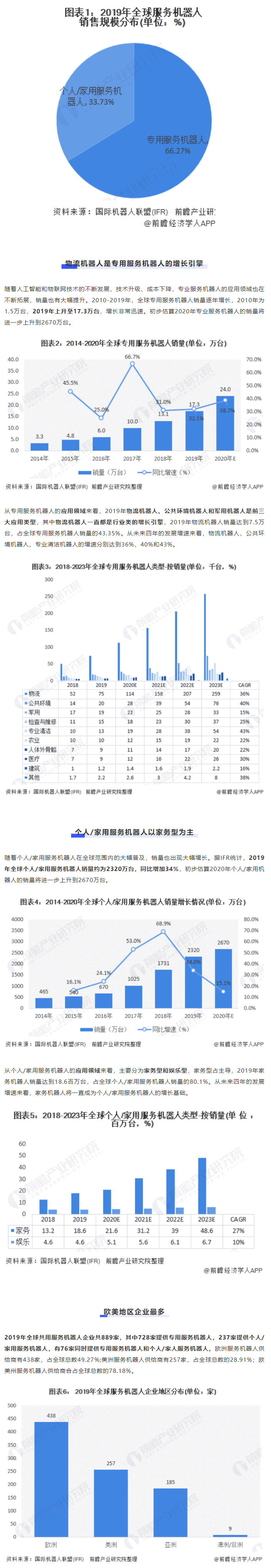 根據(jù)機器人的應(yīng)用環(huán)境,國際機器人聯(lián)盟(IFR)將機器人分為工業(yè)機器人和服務(wù)機器人。其中,工業(yè)機器人指應(yīng)用于生產(chǎn)過程與環(huán)境的機器人,主要包括人機協(xié)作機器人和工業(yè)移動機器入;服務(wù)機器人則是除工業(yè)機器人之外的、用于非制造業(yè)并服務(wù)于人類的各種先進機器人,而服務(wù)機器人又分類為專用服務(wù)機器人和個人/家用服務(wù)機器人。2019年,服務(wù)機器人實現(xiàn)銷售收入169億美元,其中專用服務(wù)機器人實現(xiàn)銷售收入112億美元,個人/家用服務(wù)機器人實現(xiàn)銷售收入57億美元。