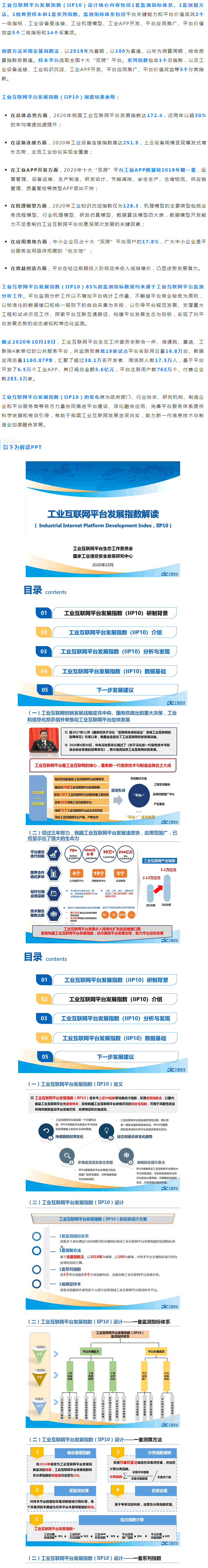 在2020年10月21日的兩化融合暨工業互聯網平臺大會的開幕式上,工業互聯網平臺發展指數(IIP10)正式發布。該指數是受工業和信息化部信息技術發展司委托研究,由工業互聯網平臺生態工作委員會和國家工業信息安全發展研究中心聯合研制。