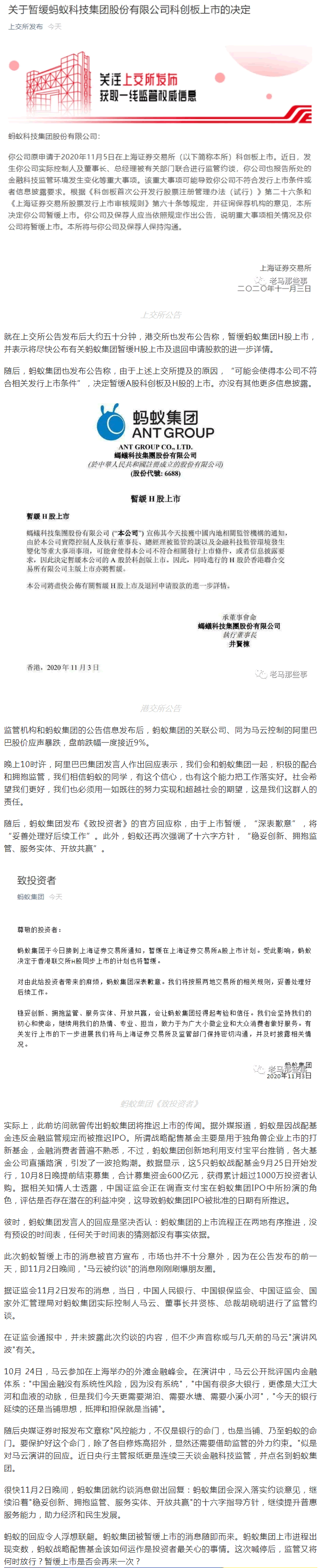 螞蟻集團(688688.SH、6688.HK)在滬市科創板IPO計劃突然暫緩,同時進行的H股于香港聯合交易所有限公司主版上市亦將暫緩