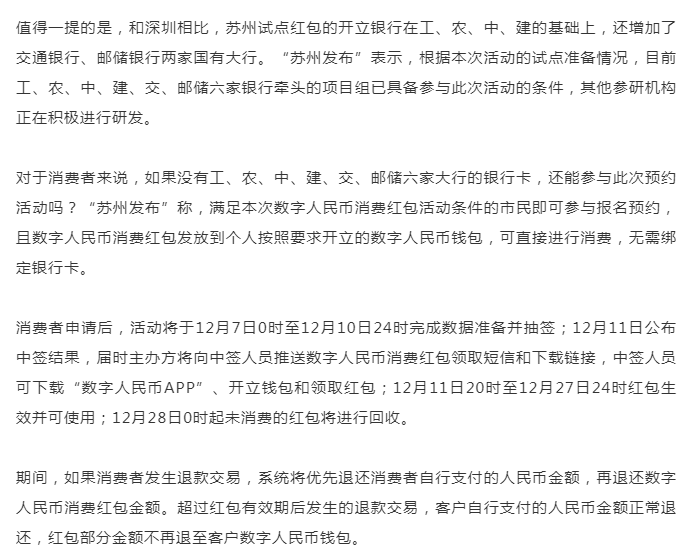 根據(jù)“蘇州發(fā)布”,此次“雙12蘇州購物節(jié)”數(shù)字人民幣消費(fèi)紅包將采取“搖號抽簽”形式發(fā)放,非先到先得,無需爭搶。抽簽報(bào)名通道自2020年12月5日0時(shí)正式開啟,持續(xù)至12月6日24時(shí)。
