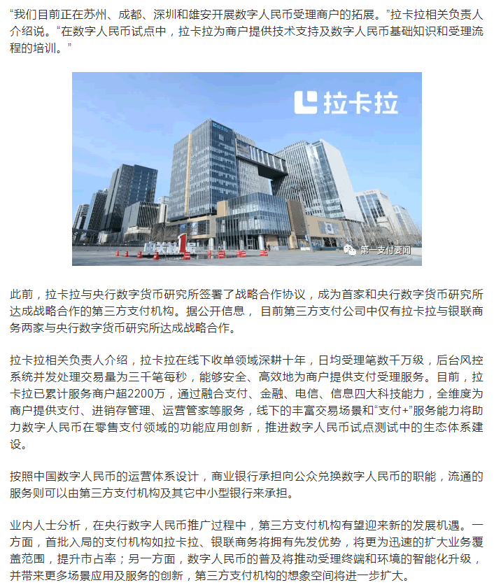 據(jù)了解,作為首家開(kāi)通數(shù)字人民幣受理服務(wù)的支付機(jī)構(gòu),此次拉卡拉參與蘇州雙十二活動(dòng)的商戶(hù)門(mén)店數(shù)近千家,包括全國(guó)知名連鎖藥店,商超,化妝品店,餐飲店,酒店,連鎖美甲店,汽配店等。此次蘇州數(shù)字人民幣消費(fèi)紅包測(cè)試支持掃一掃、碰一碰(雙離線(xiàn))等非接觸支付方式。
