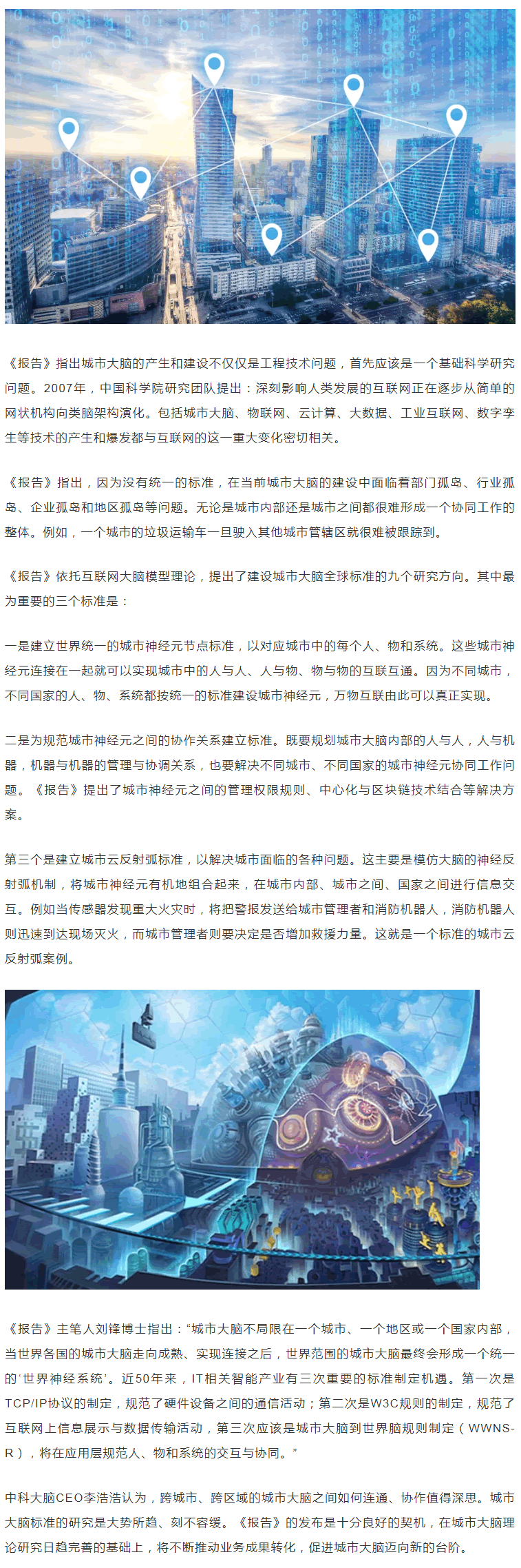 12月23日,城市大腦標(biāo)準(zhǔn)研究組、中國科學(xué)院虛擬經(jīng)濟(jì)與數(shù)據(jù)科學(xué)研究中心等單位聯(lián)合發(fā)布了世界首份《城市大腦標(biāo)準(zhǔn)研究報(bào)告》(以下簡稱《報(bào)告》)。《報(bào)告》詳細(xì)闡述了城市大腦的起源、發(fā)展、現(xiàn)狀和趨勢,并發(fā)布了相關(guān)理論基礎(chǔ)和構(gòu)建城市大腦標(biāo)準(zhǔn)的九個研究方向等一系列重要研究成果。