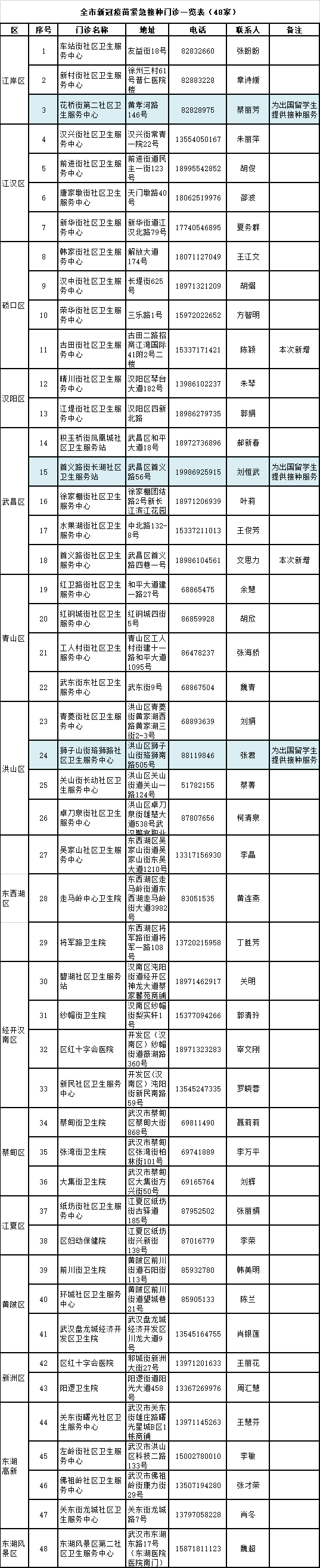 武漢市15個區、48家指定的預防接種門診名稱和地址: