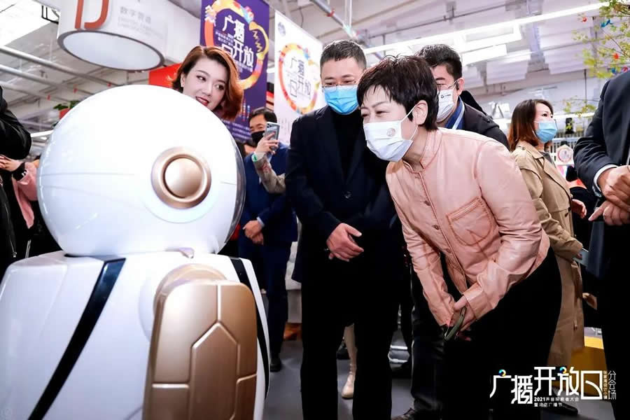 作為特邀智能講解員,“創創”擔任了活動現場“志愿者”工作,宣傳講解、信息查詢、迎賓接待等多項任務,都出色的完成了。萌萌的造型加上流暢的語音交互,以及專業的導覽講解服務,智能講解機器人“創創”收獲了一大批觀眾的圍觀和好評。傳統媒體廣播平臺加入機器人元素,以趣味、科技、創新的方式既拉近了廣播與觀眾的距離,也加深了觀眾對人工智能產業的了解,營造出了火熱的活動氛圍。 北京市委宣傳部副部長、北京廣播電視臺臺長余俊生、副總編輯李秀磊、通州區宣傳部部長湯一原、張家灣設計小鎮專班組長余龍共同為京津冀之聲直播間“揭幕”,并親切看望了智能講解機器人“創創”。
