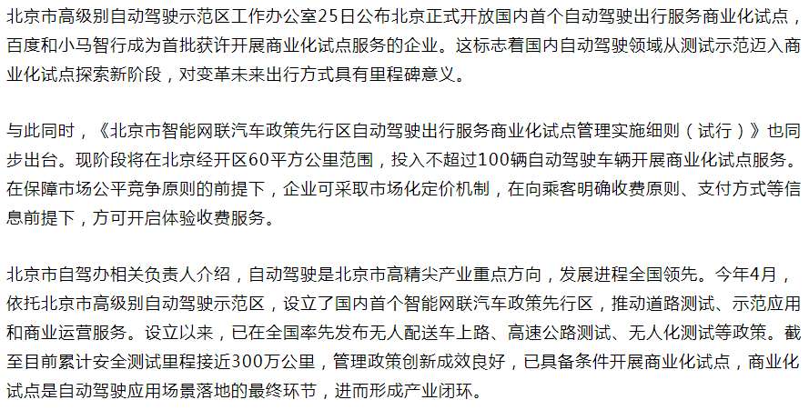 北京市智能網聯汽車政策先行區自動駕駛出行服務商業化試點管理實施細則