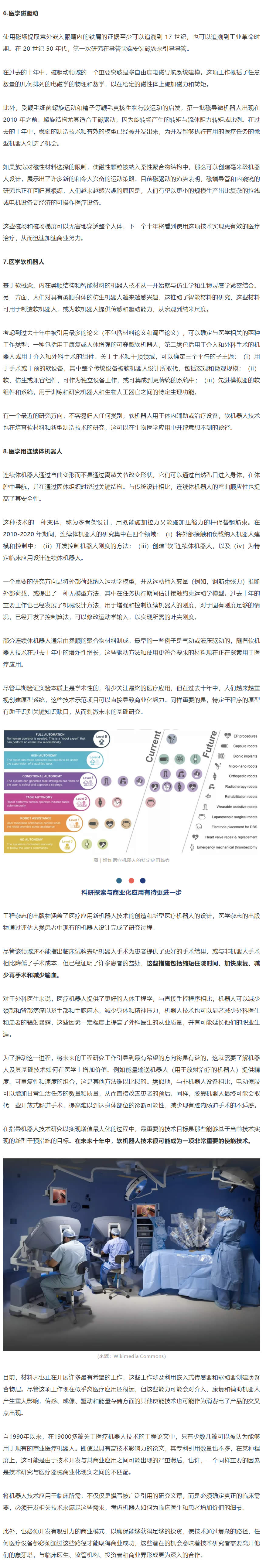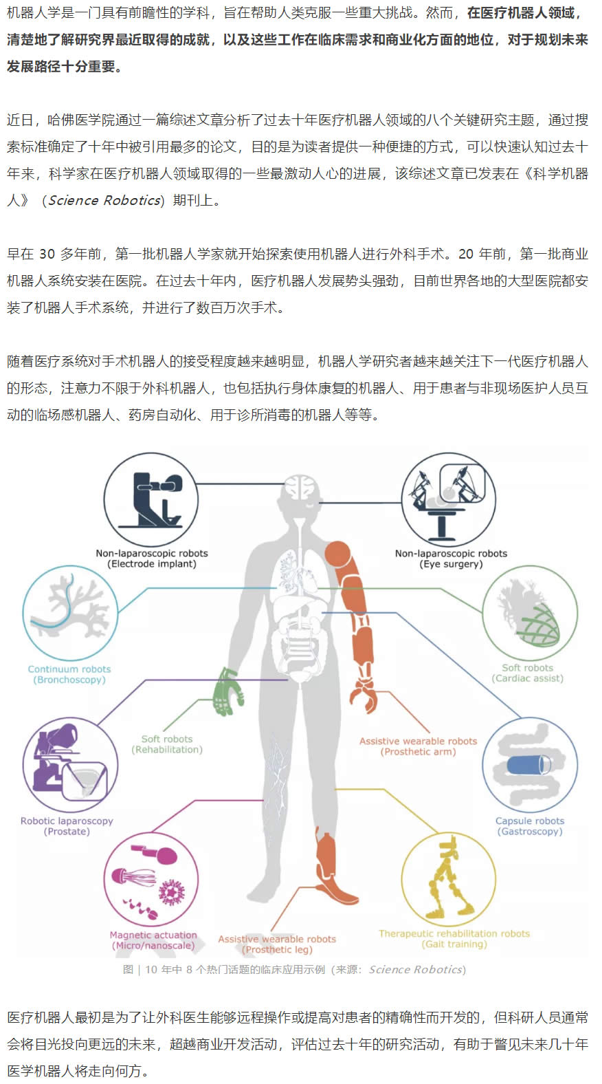 研究人員通過搜索 2010-2020 年期間《科學》雜志上被引用多的醫療機器人論文,確定了八個熱門研究主題,包括機器人腹腔鏡、用于微創手術的非腹腔鏡機器人、輔助穿戴式機器人、治療康復機器人、膠囊機器人、磁驅動、軟體機器人和連續體機器人等。