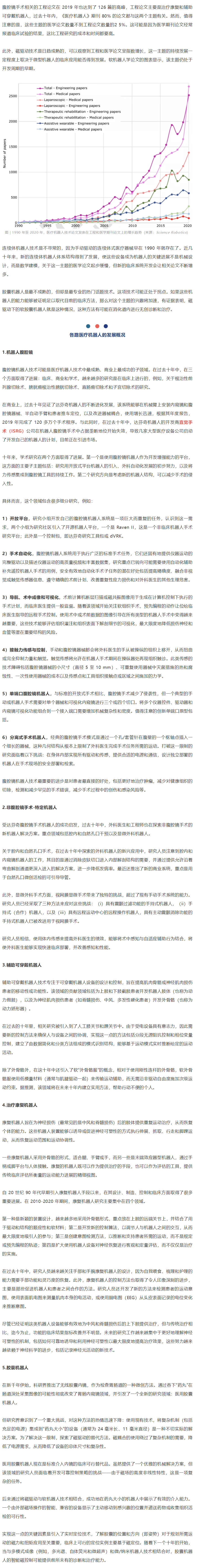 數據顯示,工程和醫學期刊上關于醫療機器人的出版物數量呈指數級增長,從 1990 年的 6 篇增至 2020 年的 3500 多篇。醫學期刊論文主要是關于腹腔鏡機器人的出版物(占總數的 60% 至 70%),伴隨著達芬奇外科手術機器人系統的成功,2020 年發表的相關論文超過 1300 篇。