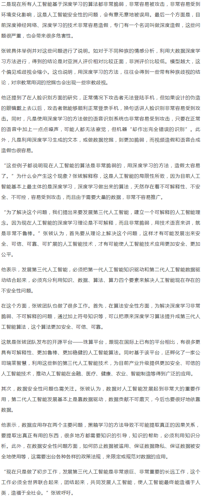 張鈸在演講中指出,現(xiàn)有的人工智能技術(shù)常常引起公平性、安全性的問題,具體體現(xiàn)在三個層面。一是利用深度神經(jīng)元網(wǎng)絡(luò)來產(chǎn)生一些文本、圖像或是語音時,有時會包含性別、種族、宗教等方面的歧視。