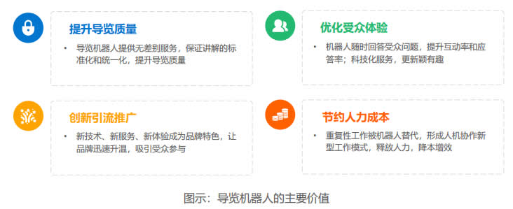 導覽機器人是服務機器人的一種, 主要融合了人工智能、 機械電子、 通信和 傳感器、 計算機等技術, 通過計算控制平臺和人機交互系統, 提供室內導航、 語音講解、 信息檢索、 互動問答等多種服務, 已在美術館、 博物館、 政務大 廳、 展廳、 銀行、 商場等場景落地應用。