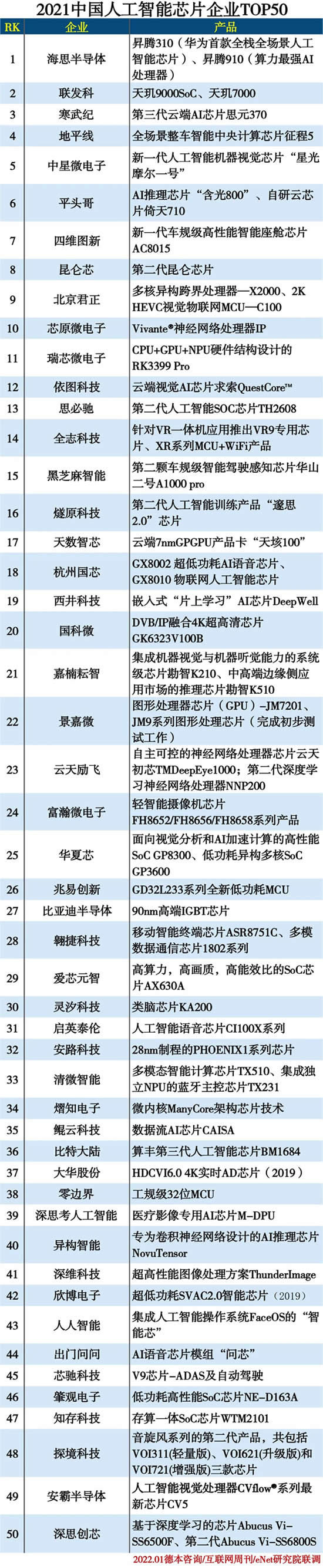 2021中國人工智能芯片企業TOP50