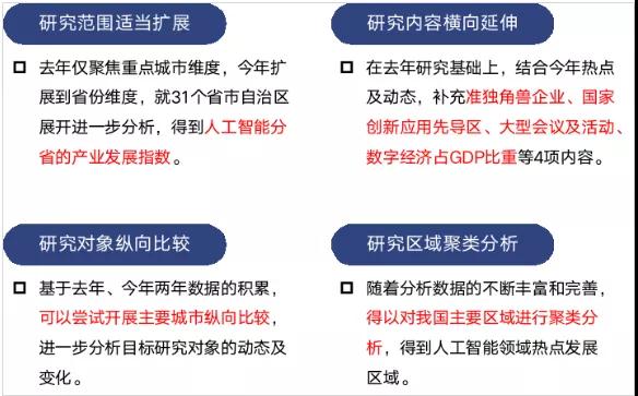 變化及亮點方面,今年AI指數在研究范圍、研究內容、研究對象、研究區域等維度均進行了豐富和完善,包括從僅分析市級維度擴展到省級維度、增加國家創新應用先導區等指標、增加年度縱向比較和區域聚類分析等,可以說亮點紛呈。