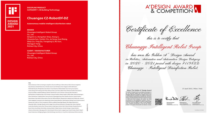 ◇在:創(chuàng)澤是榮獲國際CES創(chuàng)新獎的商用類人型智能服務(wù)機(jī)器人企業(yè),也是國內(nèi)榮獲德國歷史悠久的2021年iF 設(shè)計(jì)獎的移動式消毒機(jī)器人企業(yè);同年,創(chuàng)澤榮獲意大利A'Design Award金獎。