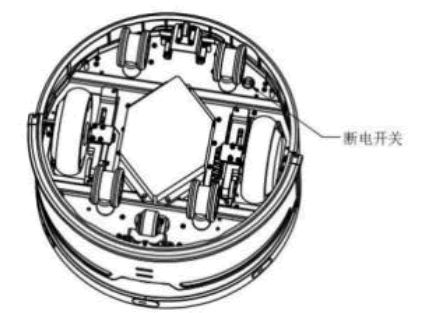 機器人底部帶有電源總開關,位于機器人后方右側萬向輪旁邊 ,用于斷開電池電源。出⼚時默認開啟。當機器存在時間(超過一個月) 不使時, 需要將電源總開關撥動至關閉狀態(tài),避免長時間不使而導致電池電量虧損狀態(tài),再次使用時需要手動將開關撥動至打開狀態(tài)。