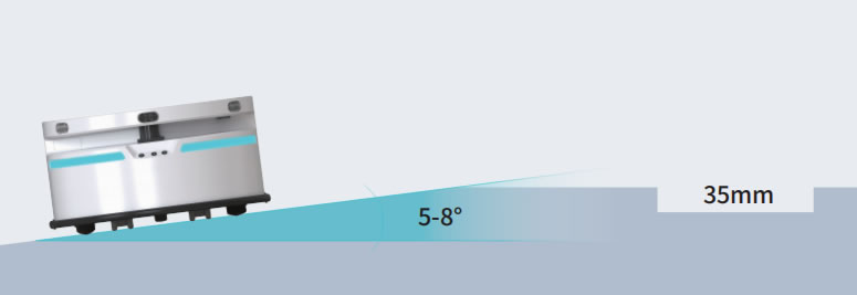 在平地上擁有穩定可靠的導航避障性能,在面對坡度、過坎這些障礙物時,也擁有穩定的行走性能。擁有5-8°爬坡能力、10mm過坎G度能力,35mm寬坎間距離,滿足J大部分場景應用。