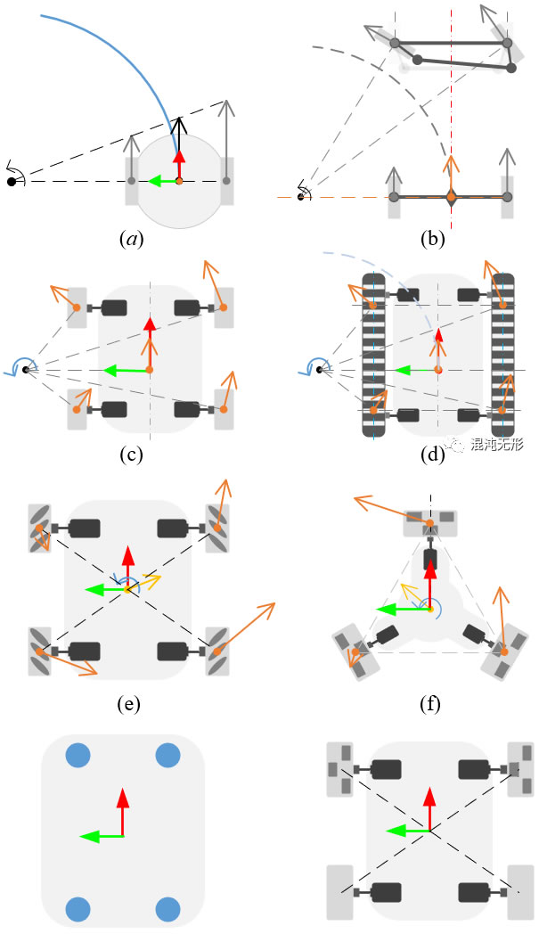 機器人開發平臺常見8種構型.(a)兩輪差速驅動機器人,(b)car-like robot,(c)四輪驅動機器人,(d)履帶式機器人,(e)麥輪全向平臺,(f)全向輪全向平臺,(g)四驅四轉機器人,(h)四驅異構機器人.