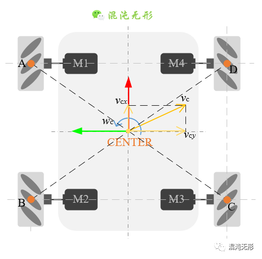 要滿足上述的分力能夠相互抵消的條件是麥輪(或電機)轉速大小相同,因為每個麥輪受到的地面支持力相同(基于假設①②),4個電機又勻速等速轉動,意味著電機輸出扭矩與地面作用于麥輪的摩擦力是平衡的,4個麥輪摩擦力在輪轂軸向和徑向上分解的大小是相同的,而速度分解與力分解類似,所以4個麥輪沿輪轂軸向和徑向的分速度大小是相同的。