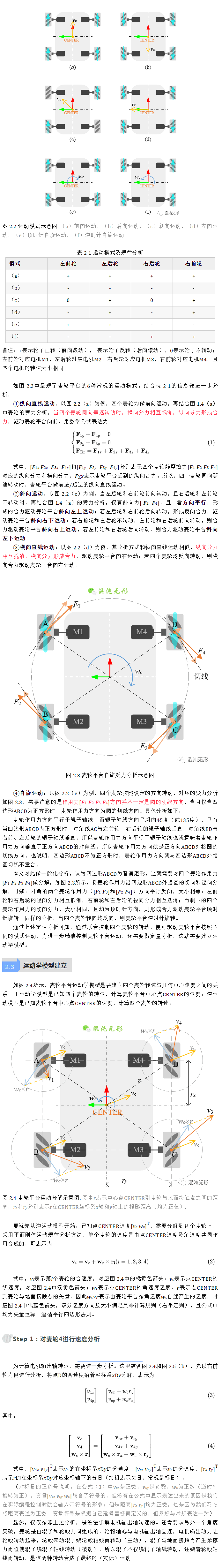 基于上述假設條件,并按照一定規律聯合控制四個輪子等速轉動,便可實現。這是因為輪轂軸與輥子轉軸夾角呈45度,如圖 1.2(c)所示,沿輥子軸線的靜摩擦力可沿著輪轂軸向和徑向分解,進一步遷移至圖 1.4分析,只有當輪轂軸與輥子轉軸夾角呈45度時,才能保證左右和前后對稱位置的(等速)麥輪在輪轂軸向及徑向上的分力可以恰好相互抵消,進而形成合力而運動。