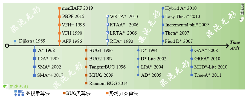 圖規(guī)劃算法根據(jù)路徑生成方式的不同分為三類,其中以圖搜索算法為主,以及BUG算法和勢(shì)場(chǎng)力算法。