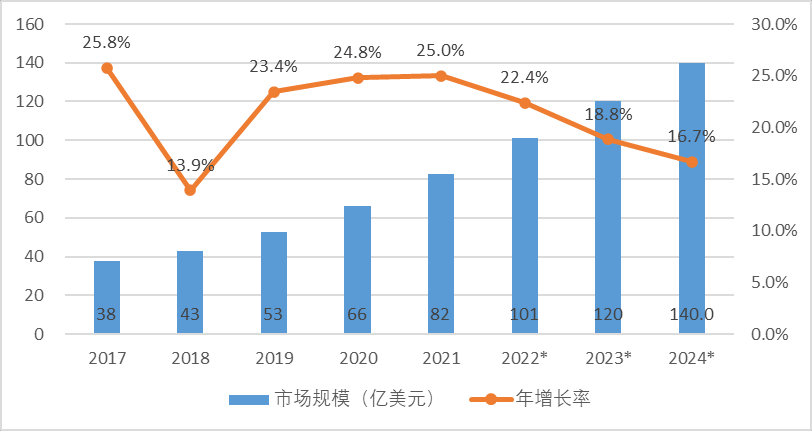 機器人+ 應用不斷拓展深入,產業整體呈現欣欣向榮的良好發展態勢,2022中國機器人市場規模將達到174億美元, 五年年均增長率達到22%