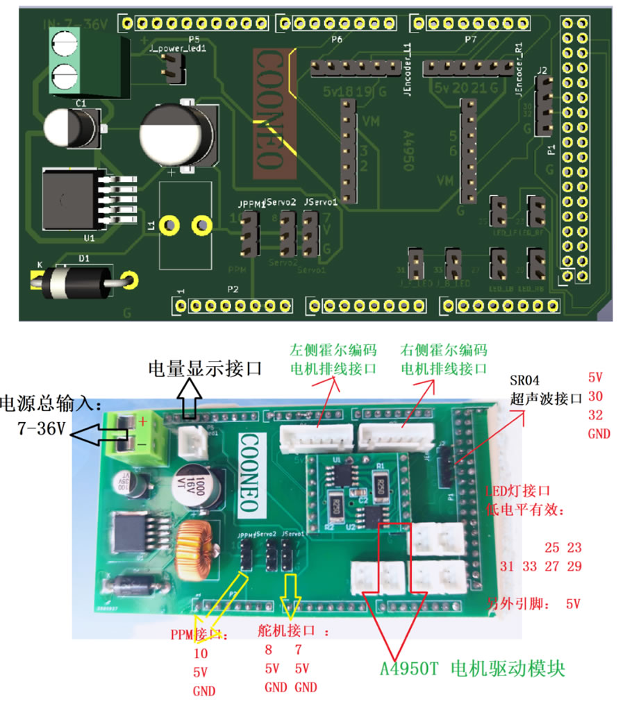 如圖所示,擴展板右下角留有的6路白色LED接口,接口型號是 XH2.54 mm 的2Pin插座,支持杜邦線,也支持型號一致的插頭。每一個插座中,有一個引腳聯通了擴展板板載的LM2596s-5.0A 芯片5V的輸出端,另外一個引腳則聯通Arduino開發板的數字接口,其引腳ID如上圖中所示。(25、23、31......)