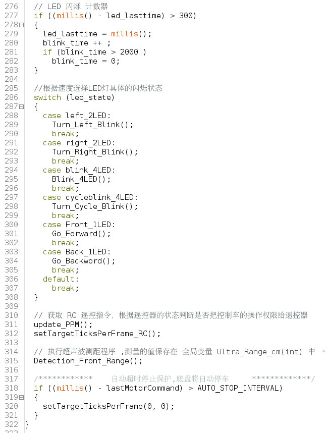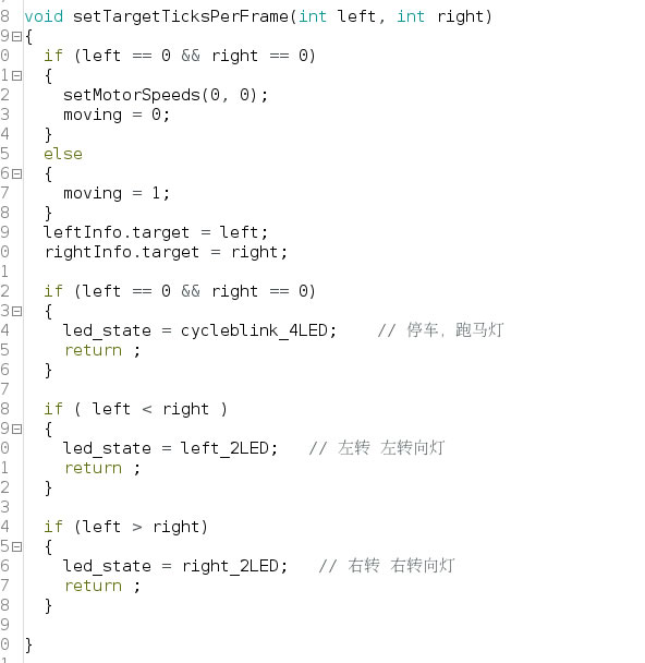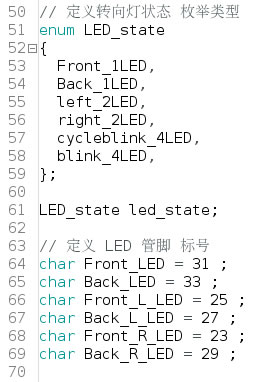 該部分代碼,說明了LED閃爍狀態的切換方式,其切換的依據是依靠左右輪執行的速度差來決定的。如: