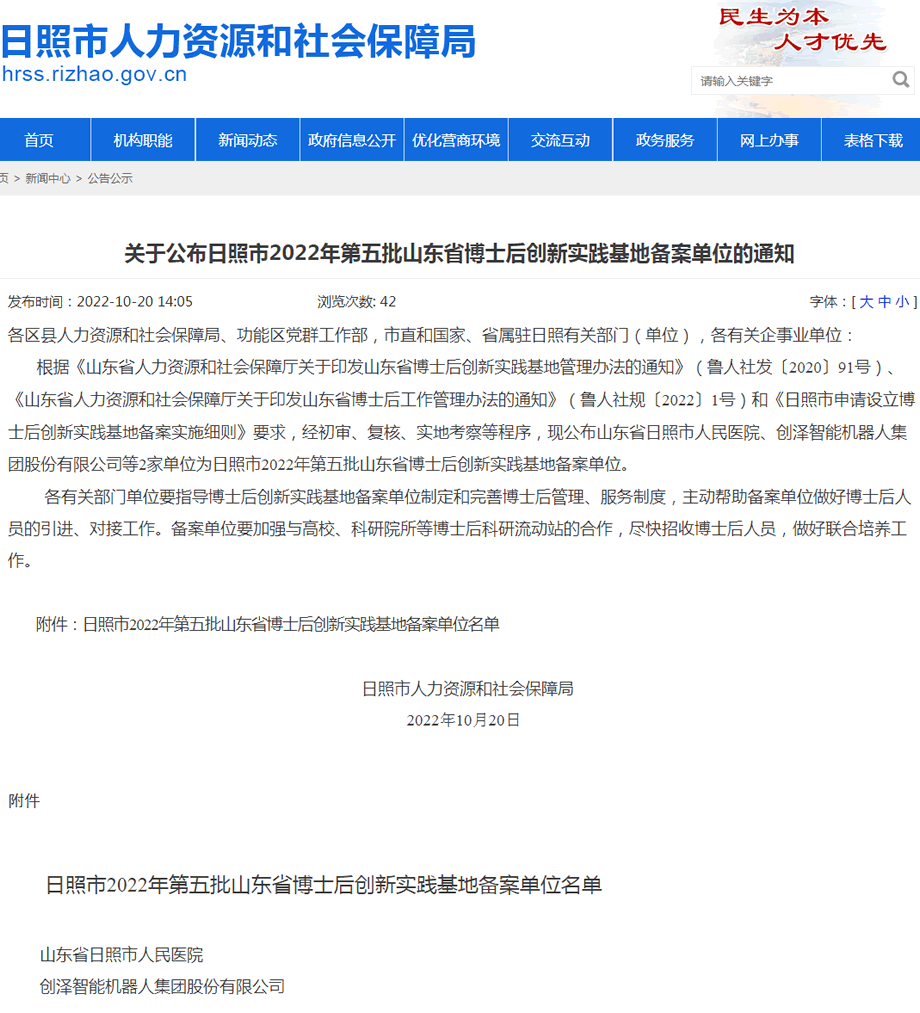 近日,日照市人力資源和社會保障局公示了2022年山東省博士后創新實踐基地擬備案單位的名單,創澤集團憑借優秀的自主研發和創新能力,經有關部門考察調研和專家評審,成功獲批山東省博士后創新實踐基地備案單位 。