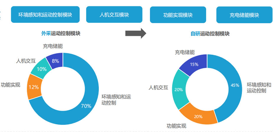 其中,人機交互模塊、功能實現模塊和充電儲能模塊基本實現自研。以往,環境感知和運動控制模塊會有部分企業選擇外采,但隨著技術的進步以及成本考慮,現在多數機器人企業也實現了環境感知和運動控制模塊的自研。