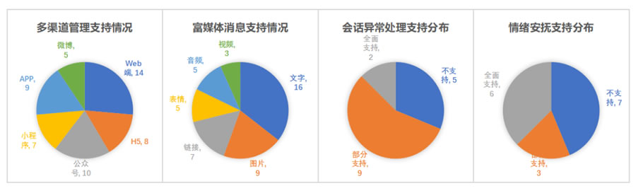 總體而言,參評產品在多渠道管理支持能力和富媒體消息互動支持能力方面表現良好,所有參評產品均支持兩種及其以上渠道管理,G的支持達到六種,多面覆蓋了PC端和移動端用戶。參評產品在會話異常處理上表現比較接近,大部分產品部分支持該功能,在情緒安撫功能支持上兩J化差異較明顯,多面支持和不支持數量相近,兩者合計數量占比超過八成。主要有以下三個方面的特點: