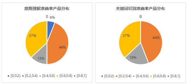 通過圖3中的性能指標產品分布情況可知,多數參評產品意圖理解和關鍵詞識別準確率分布在[0.2,0.4)和[0.6,0.8),反映出參評產品在性能上的兩級分化,建議相關企業及時豐富疫情相關語料并進行產品優化,提升問題解決率。