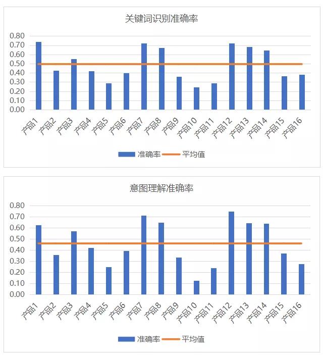 總體來看,各家參評產品在關鍵詞識別和意圖理解能力上參差不齊,準確率G值與低值相差都超過了50個百分點。在關鍵詞識別能力上,有6款產品的準確率超過60%,基本可以識別出“新型G狀病毒”、“N95口罩”、“發燒干咳”、“密切接觸者”等疫情強相關詞匯,以進行關鍵詞匹配和擴展,確保答復的準確性和豐富性。在意圖理解能力上,有7款產品的準確率超過50%,可對用戶提出的問題有針對性的進行答復、相關問題推送和情緒安撫,從而提供準確、及時、有效的服務。