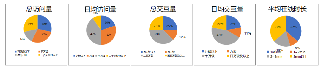 從訪問量上看,超七成產品的總訪問量達到了百萬級,其中總訪問量超過二百萬和三百萬的產品約占三成;從日均訪問量上看,約70%的產品日均訪問量在一萬到二十萬之間,僅有10%的產品突破了二十萬大關;從交互量上看,約75%的產品總交互量超過了百萬條,約78%的產品日均交互量超過一萬條;從用戶平均在線時長上來看,超五成產品達到了2分鐘以上,約37%的產品用戶平均在線時長不足1分鐘,另外平均在線時長超過3分鐘的產品數約占36%。