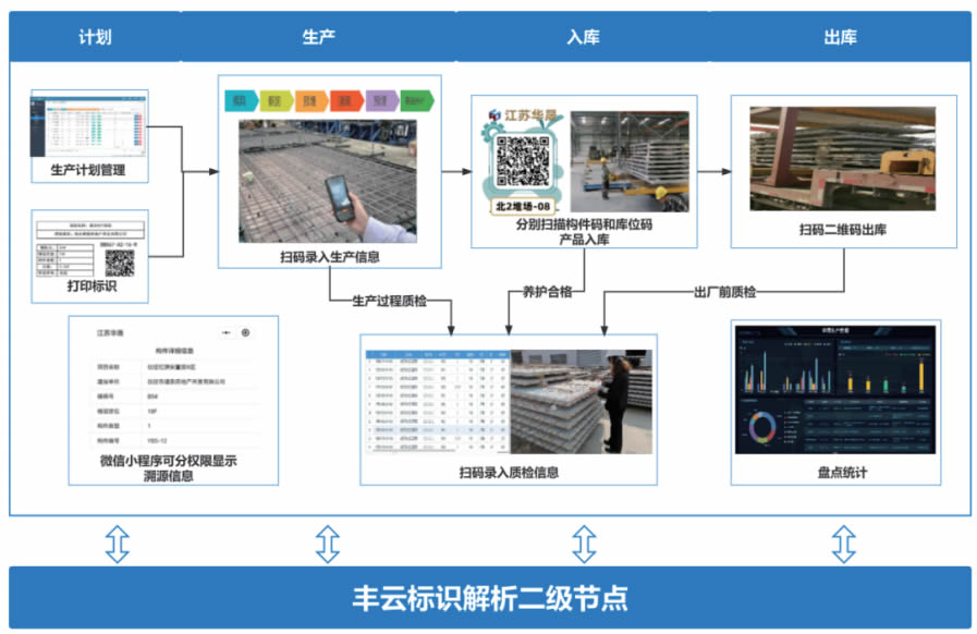 江蘇豐尚智能科技有限公司基于上述痛點,與江蘇華晟新型建筑科技有限公司展開合作, 開發基于標識的生產質資及倉庫管理平臺,將項目信息,構件分類,批次,生產工藝等提前錄 入系統,對接標識解析體統生成符合要求的標識碼。系統結合生產數據的任務工作蠹,按照工 程建造的構件安裝需求進度以及工廠既有產能和生產流程,制定工廠構件生產計劃。按生產 線、項目、樓號、樓層、構件類型,形成日生產任務單,提前規劃生產所需用料。生產過程 中,用戶可通過二維碼對構件生產工藝、構件信息進行追溯、跟蹤與管理。構件生產完成之 后,通過出色程一掃碼步驟完成質檢、貨運、信息錄入等多流程的實時記錄。庫位和構件信息 都可以通過PDA端程序實時查詢。方便臨檢或盤點人員盤點。該平臺部署以來,幫助裝配式建 筑全生命周期信息共享和傳遞,排產計劃準確率提升12%,基于數據分析大幅提G產品質量, 簡化出入庫流程,出入庫時間縮減30%左右。