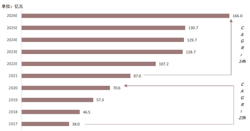 至2026年的166億元,CAGR為14%。