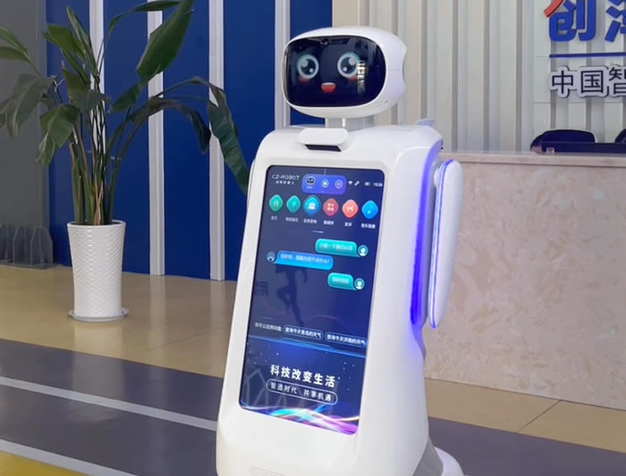 創(chuàng)澤立式迎賓機(jī)器人具有1米5的身G,身上的27寸大屏幕用于顯示內(nèi)容,成年人只需要向下低一點(diǎn)頭就可以查看上面的信息,還可以使用語音溝通功能,直接對話交流,互動(dòng)起來也很便捷。