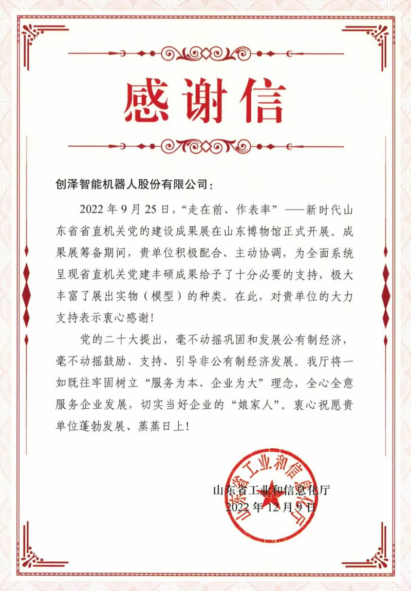 近日,創澤智能機器人集團股份有限公司收到了山東省工業和信息化廳發來的感謝信。省工信廳對創澤集團于“走在前、作表率”——新時代山東省省直機關黨的建設成果展籌備期間,積J配合、主動協調,為多面系統呈現省直機關黨建豐碩成果給予了十分必要的支持,J大豐富了展出實物(模型) 的種類,表達了G度贊譽。